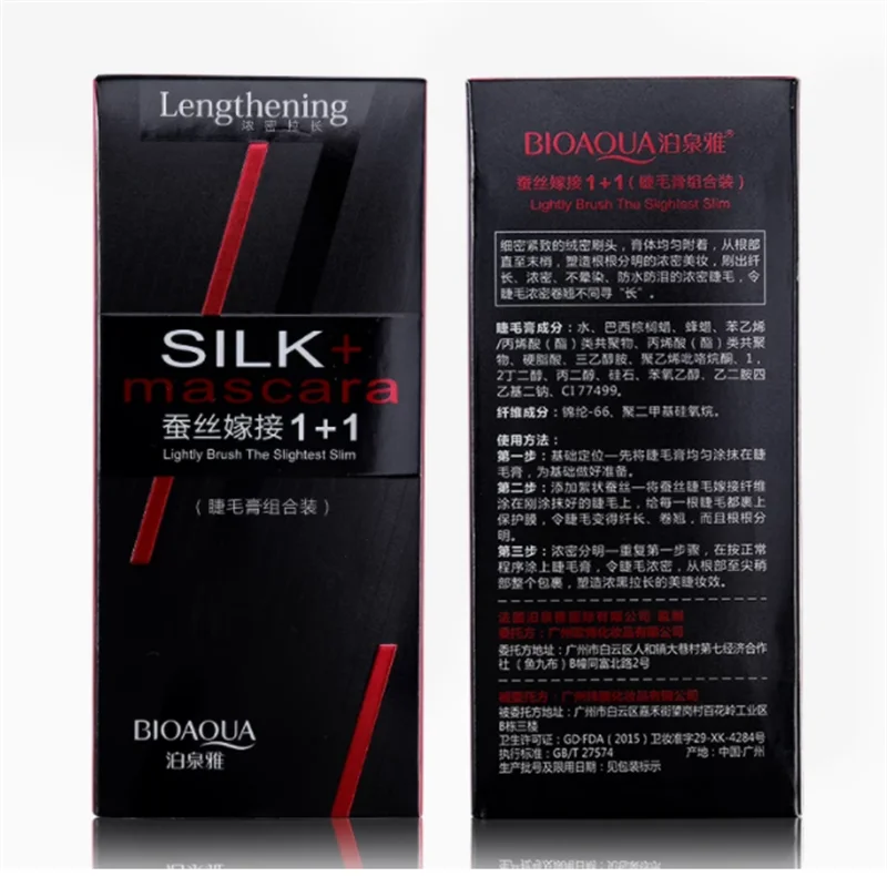 Brand:BIOAQUA Product Name:Silk + Mascara Set Shelf Life:3 years Net Wet.:10g + 1.5g Product Features: 1 Thick Lenghtening Mascara-Waterproof Sweatproof Smudgeproof -As thick as feather-like lases,easy to create your charming eye makeup. -Compact velvet brush head,paste evenly attached,to shape beauty makeup. -Easy to use,easy to wear makeup,can take care of the upper and lower eye- lashes of each subtle angel,even the beginner can easily grasp. 2.Silk Eyelashes Grafting Fiber-Silk Fiber Lengthening & Thick 1+1>2 -Grafting and moisturizing eyelashes,makes rich thick eyelashes effect. -Create lengthening thick eyelashes,makes charming eyes makeup. Usage: Step 1:Foundation - Apply mascara evenly to the eyelashes. Step 2:Coated with silk eyelash fiber on the eyelashes,makes eyelashes be long and curling. Step 3:Brush a layer of mascara again, so that eyelashes thick and black.To shape a long black eyelashes makeup effect. Package Content:1 X Silk + Mascara
