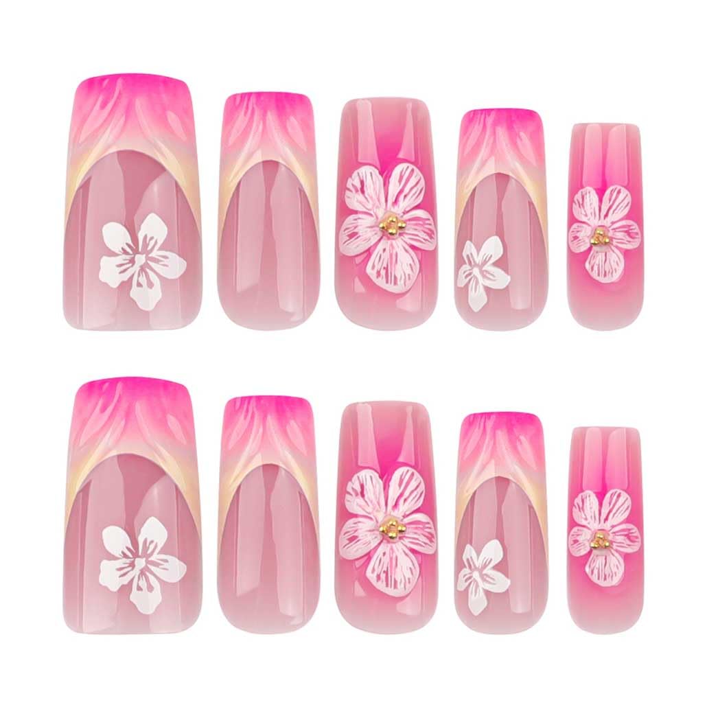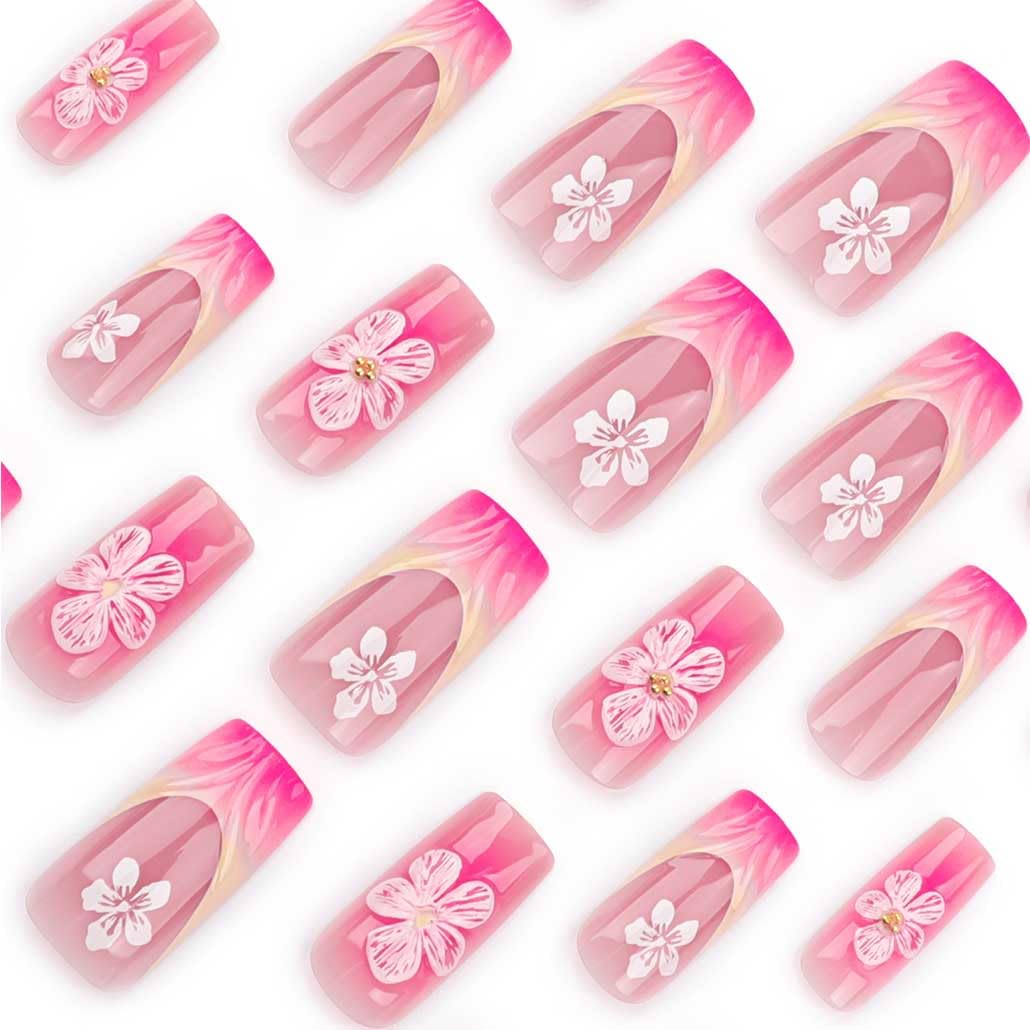 Glossy Pink Square Press-Ons | 3D Flower French Art